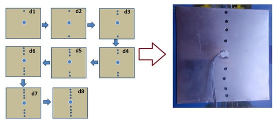 For the first study, a square aluminum plate with dimensions 100 mm × 100 mm × 1 mm was used. Holes were introduced sequentially from either side of the plate (top and bottom) towards the center of the PZT. The diameter of each hole is 3 mm. The distance between the holes is about 1 cm. The nearest holes are at a distance of 1.5 cm from the center of the piezo-actuator. Two sets of measurements were carried out for the reference (healthy state) and after each hole was introduced in the plate. The measurements were carried out at room temperature (23 ± 1). The diagram of drilled holes and their sequence are given in Figure 2. The measurements were carried out over the frequency range of 1 kHz to 5 MHz with a step size of 200 Hz.