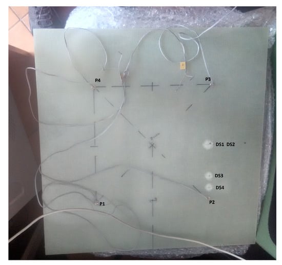 The third sample studied was a woven GFRP plate (Figure 4) of the size 500 mm × 500 mm × 3 mm. The measurements were performed in stable room temperature conditions and in the frequency range of 1 kHz to 5 MHz with a step of 200 Hz. The impact was made by dropping a projectile with a spherical end on the sample surface. The impact was made by a steel ball integrated with a cuboid structure having a total mass of 1.3 kg, the height for dropping the projectile was 2.39 m. The estimated energy of a single impact was 30 J. The total four impact made on sample and description of the impact data on the GFRP sample surface is given in Table 1. Although the figure shows 4 PZT sensors, only results from sensor P2 are presented here. The other sensors were far away from the impact locations and were observed to be insensitive to damage.