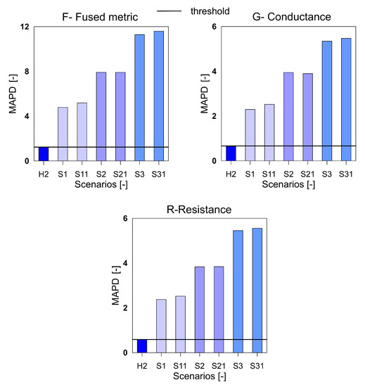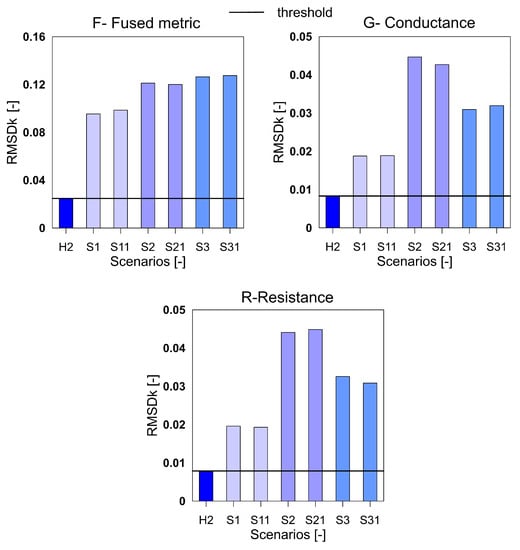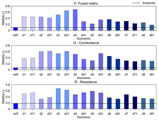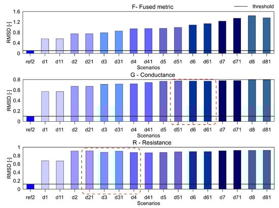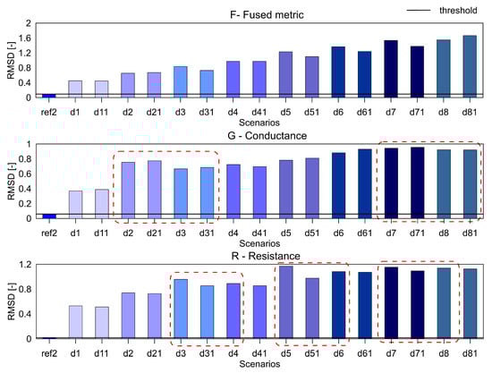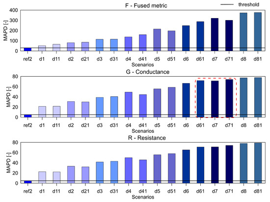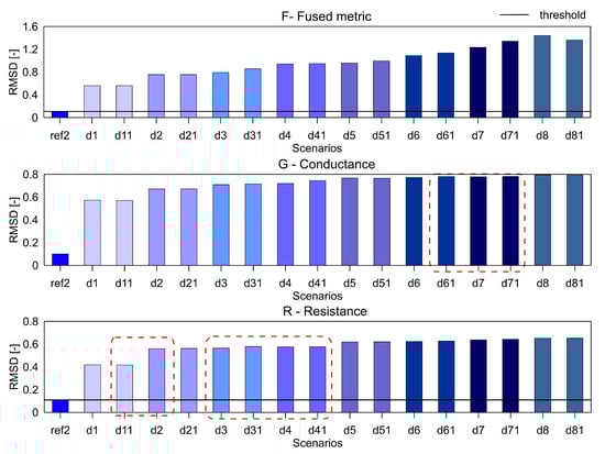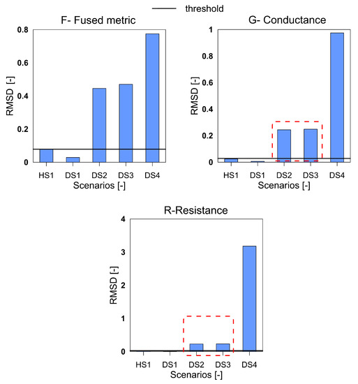 It can be seen that the metric F for the RMSD and MAPD indices shows an increasing trend as the number of holes increases (an increase of damage severity). This trend is not seen for the G and R spectrum with notable differences highlighted by the red dotted boxes. The RMSDk compares the new measurement with the previous state, hence there is no increasing trend, but all the damage scenarios exceed the threshold value determined from the ref2 scenario.