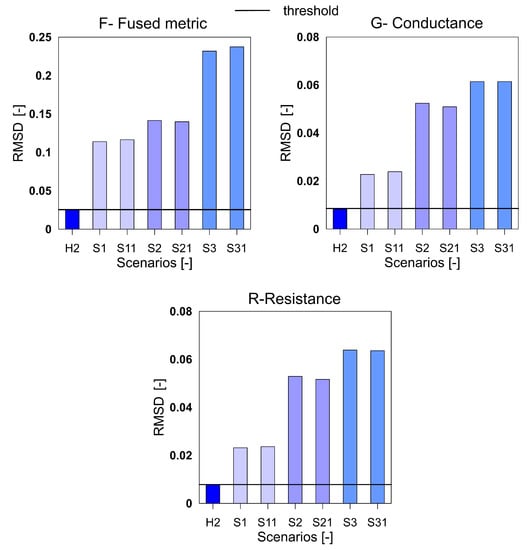 The RMSD index for the variables F, G and R for GFRP plate.