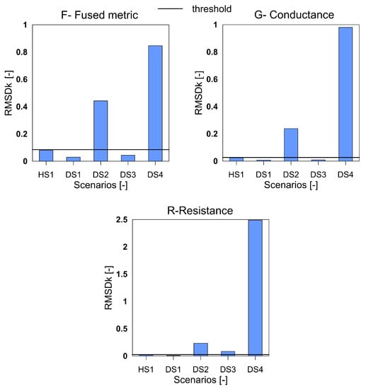 It can be clearly seen that for all the three index with F, G, and R the damage scenario DS1 is not detected. The damage in the structure due to the first impact was very low and a significant distance away from the sensors and is understood to be the reason for missed detection. All the subsequent damage scenarios are satisfactorily detected by the three variables. A point to observe is that for the cases DS2 and DS3, the variable F shows a greater difference than the G and R variables, which points towards a higher sensitivity to differentiate between the damage of different magnitudes. Due to this enhanced sensitivity, and ability to differentiate between the damage scenarios the F metric is preferable than the G and R.