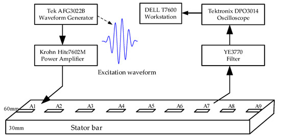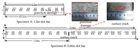 As shown in Figure 6, a puncture damage with the diameter of 1 mm and the depth of 6 mm is induced approximately 82.5 cm from the left end of specimen A, and a surface crack damage with the length of 20 mm, the width of 2 mm, and the depth of 2 mm is induced approximately 1.28 m from the left end of specimen B. In [22], a five-cycle Hanning window sine pulse narrow-band signal with a center frequency of 13 kHz was used as the excitation signal to detect the stator insulation damage in the experiment.