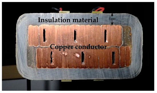 The stator bar specimen used in this experiment is taken from an 18 kV/300 MW large motor. Figure 5 shows the cross section of the 60 mm × 30 mm stator bar with an insulation material thickness of 6 mm; which is molded and solidified by epoxy mica tape and wrapped around a copper conductor.