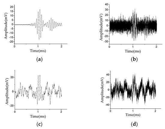 Waveforms of Lamb wave damage signal D(t): (a) pure damage signal; (b) damage signal with white noise; (c) damage signal with environment noise; (d) damage signal with mixed noise.