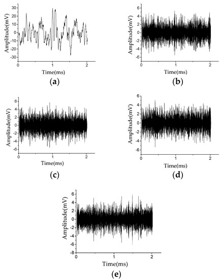 Second, the VMD method is used to further decompose the Lamb wave signal. As an example, the BLIMF sub-components are obtained after decomposing the Lamb wave damage signal with mixed noise (see Figure 8d), as shown in Figure 9. In practical application, the choose of K is usually related to the number of noise types. In this study, the impact of white noise and environmental noise on damage location is mainly considered. In order to avoid the over-decomposition of the damage signal (see Figure 8d), and to simulate the complexity of the generator operating environment as much as possible, the damage signal is decomposed into five sub-components.