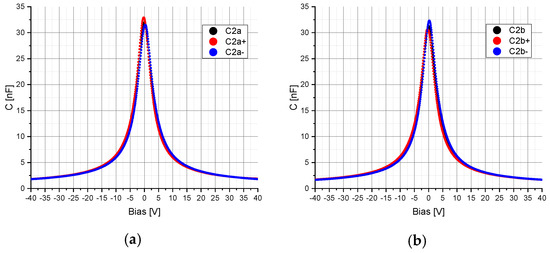 4. The amplitude was set to 5 mV and was superimposed with a DC bias voltage varying in the range from −40 V to +40 V with a resolution of 801 points. To determine the hysteresis, the electrical capacitance of C