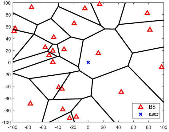 In this network model, the spectral efficiency is investigated for an arbitrary user. By Slivnyak–Mecke’s theorem [33], the user is assumed to be located at the origin without loss of generality The user located at the origin is denoted by the index k and the serving BS of user k by . When the distance from the BS i and the user k is denoted by , the homogeneous PPP is defined as . In Figure 1, a PPP-based cellular network model is illustrated with . From the described cellular network model, the received signal of the user k is expressed by