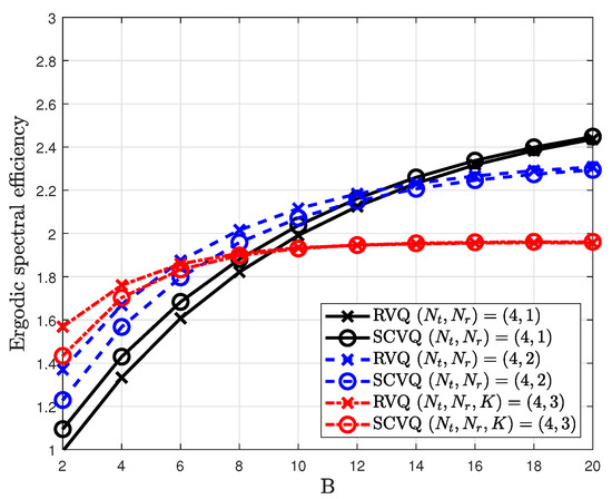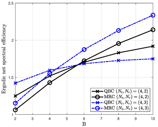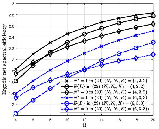 It is shown that the simulation result is lower than the analysis result for all cases. The analysis result approaches the simulation result as the number of feedback bits B increases. Thus, for a large number of B, the QBC is considered to reduce the number of transmit antennas of the effective channel as . From the distribution in Equation (16), the ergodic spectral efficiency is derived as