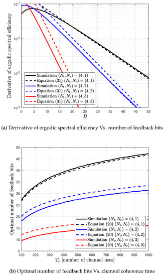 Because the number of feedback bits B increases, the feedback period to convey the CDI also increases. Accordingly, the ergodic net spectral efficiency in Equation (14) decreases. Thus, finding the optimal number of feedback bits is an important problem in interference limited cellular networks. This optimal number of feedback bits with respect to channel coherence time is derived as