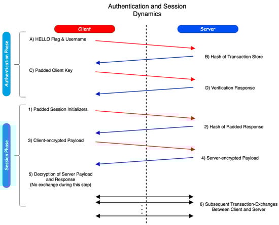 The hybrid method used in this scheme draws from elements of both symmetric and asymmetric cryptographic schemes. The full explanation of the techniques employed is broken down in Section 4, as they appear throughout the logistical explanations of the scheme. Hybrid encryption was employed for retaining the efficiency and speed of symmetric encryption alongside the secure key distribution methodology and deployability of asymmetric encryption []. Furthermore, this scheme uses what may be considered a pseudo-‘hash chain’ scheme for two-way verification and dynamic one-time password generation. Previous research has indicated that ‘hash-chains’ as a concept are consistently a more holistically-secure method of password verification [,]. However, previously proposed hash-chain protocols not only have high-computational complexity, but often lack two-way verification [,,,]. This scheme does not use a hash-chain in the typical sense of the word, however. While the protocol mimics a hash-chain protocol functionally, it does so in a mechanical sense rather than in a literal sense. Previous protocols have focused on hashing incremental, but high complexity, values [,]. Our proposed protocol exchanges incrimination for random generation, and includes a two-way handshake-style verifications based on a cyclical authentication methodology. This is done to keep the verifiable and secure nature of hash chaining but reducing computational complexity as well as deployability. Further explanation can be found in the following Section 4. Exchanging incrimination for randomization also increases the security of generated tokens by removing patterns detectable through heuristic means. Further techniques utilized in this scheme for verification also mimic that of standard asymmetric encryption techniques, using generated client and server keys based on mutual sources. Extra caution is taken in all data transactions, in order to avoid pitfalls which create attack surfaces for MiTM attack among others. In doing so, many pitfalls which existed in solely mathematically developed hash chains have been avoided. The ensuing sections provide detailed explanation and the evaluation of the proposed protocol. The actual authentication is done through a symmetric key which is generated through asymmetric means. Although symmetric encryption is used throughout the protocol, the symmetric keys are generated through functionally asymmetric means in order to make sure sensitive data itself is never transmitted from client to server or vice-versa.