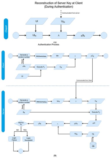 (A) User verification process—reconstruction of server key; (B) User verification process.