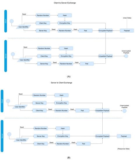 While there are both benefits and detriments to the applications of symmetric and asymmetric cryptographic schemes individually, we opt to use a hybrid scheme, taking strong traits from both of these separate techniques. Symmetric encryption uses a singular, shared key in order to encrypt and decrypt data sent between the receiver and sender. Asymmetric encryption uses two different keys, one for encryption, and one for decryption [,]. Generally, symmetric key schemes follow a uniform encryption and decryption method, sometimes in multiple or layered phases, where the same technique (or in some cases, its reverse) is applied to the cipher text for decryption and the plain text for encryption. Asymmetric encryption differs from this, using two keys generated at the beginning, related to each other, typically through a mathematical function []. One key is used for encryption, and the other for decryption [,]. Symmetric cryptography is faster, and more efficient, but harder to apply universally because of key distribution risks and management [,,,,]; meanwhile, asymmetric encryption is more scalable [,,,,].