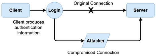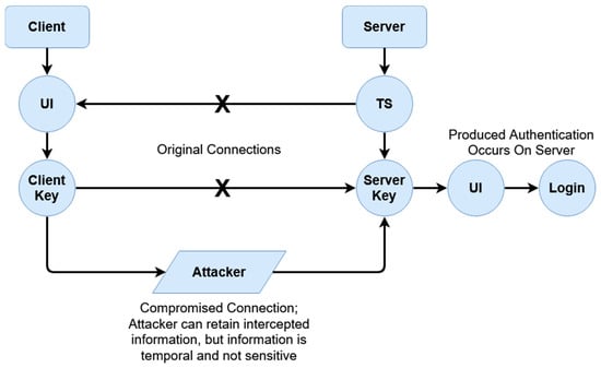 The differences in security are rendered from the fashion in which data is transferred between entities. For most common authentication schemes, regardless of how data is input, or what front-facing mechanism (graphical, multi-factor, etc.) is used, sensitive data can be exposed if a connection itself is compromised. In this given scheme, this is averted through data being separately encrypted through tokenized derivatives of a shared secret; furthermore, as sensitive data relating to logins can be compromised as shown in Figure 8 (such as passwords or password hashes), login information seized by malicious parties when this scheme is active is temporal, and is also not indicative of value of the shared secret itself. In Figure 8, the attacker has access to all data conveyed between parties; this includes, inherently, anything exchanged during authentication, which would include the login information, hashed or otherwise. If hashed, while not exposed, information can be replayed or used to mimic the client.
