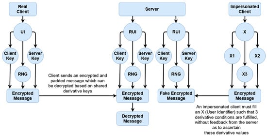 This scheme is more resilient against masquerade attacks for two reasons. Firstly, data is temporal and tokenized, so it is meaningless if compromised. Secondly, within each given session, data is essentially ‘signed’ using the tokenized key of the other party. This signing means unless the attacker can brute-force the temporal token which constitutes the key, there is no way to correctly impersonate a given user. In Figure 10, an example is given of how a masquerade attack may occur. After a real client authenticates, an impersonated client may hijack the connection, redirecting the connection back from the server to receive messages as if they were the client. Because the authentication has already occurred, even if the authentication is based on access tokens, they can still receive messages back from the server even if they cannot send further connections without re-authentication. By comparison, Figure 11 shows an example of how a masquerade attack would occur within this scheme. There are at least three factors which must be fulfilled to replicate a client; the user identifier (X), and then the derivative client key, server key, and random generated number (X1, X2, and X3). These elements are all used throughout the encryption process. Even if a malicious entity is able to intercept a client key by sniffing or otherwise, they would also need to replicate X2 and X3. As these are never explicitly sent and only stored locally, these would have to be brute-forced; however, as they are attempting to hijack an active session, by the time a first falsely encrypted message is received, action can be taken by the server as the keys not matching the keys of the server (because of sharing the same original secret, the UI, as the client) would immediately create a warning.