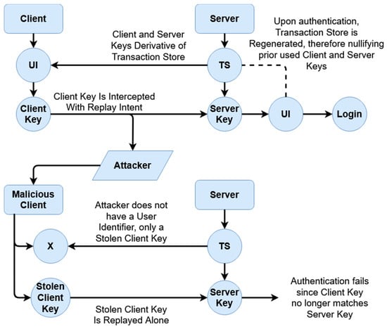 The above Figure 12 and Figure 13 display replay attacks. For typical authentication, schemes that are not tokenized are at risk of replay attacks if a packet is captured, provided a third-party authentication service (such as an access token issuer) is not provided. However, these access tokens can often still be falsified if a malicious party knows a user’s username. By comparison, the tokenized temporal nature of this scheme prevents replay attacks, as seen in Figure 13. To break down this diagram, we first look at the original transaction from which the client’s packet is captured. This happens when the padded client key is sent to the server, where the authentication occurs on the server end given the received client key. After authentication, as described within the prior section, the transaction store is regenerated given the recreated user identifier, which in turn would mean both the prior client key (which was sent) and the prior (locally used) server key derivative of the prior transaction store are now moot. The malicious client does not have a user identifier (as represented by the X in the above diagram), only the stolen client key. However, as authentication has already occurred, during the ‘replay’, the newly generated server key rejects the prior stolen client key, as it is no longer compatible.