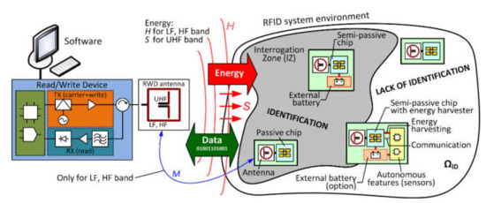 A contactless RFID identification system involves a reader–writer device (RWD) with an antenna and one or more identified objects equipped with an RFID transponder chip (Figure 1). The transponder stores identification information and other object-related data. The RWD device reads the data from the transponder and forwards it to the supporting software. In some solutions, however, the RWD may also save or update transponder data. RWD then has a dual function that allows data transmission in two directions. In such cases, the commonly used term “RFID reader” can be misleading.