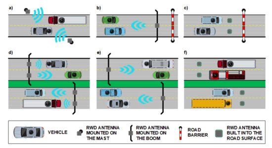 RWD antenna set-up in the traffic infrastructure: (a) on masts; (b) on boom; (c) built into road surface; (d) covering a single traffic lane; (e) covering multiple lanes; (f) built into the surface of multiple traffic lanes.