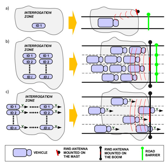 The correct identification of vehicles is therefore an important element of traffic management systems. The determination of vehicle features can be based on visual identification using surveillance cameras. However, this method has its limitations and can be unreliable in adverse weather or lighting conditions. Therefore, identification can be supported by RFID (Radio Frequency IDentification) technique using an electromagnetic field to obtain information stored in electronic form. RFID is currently used in many areas [1], such as the Internet of Things (IoT) [2], Fast Moving Consumer Goods (FMGC) in supply chains [3], and even for security and enhanced user experience at exhibitions and museums [4]. RFID, as a contactless solution, seems to fit well into tasks related to vehicle traffic. Thus, applications involving RFID, such as the maintenance of public transport [5] or the transport of goods, urban traffic management [6,7], traffic monitoring systems [8], or collecting road tolls [9,10] are currently being developed.