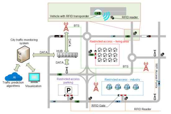 Considering the rich road and highway network and increased traffic, one can understand the growing need for monitoring, controlling, and managing this traffic. This need also results from establishing separate areas with limited traffic access, which is becoming more and more common all over the world. Some examples are parts of cities that only public transport vehicles can enter or special zones only available for certain types of cars, such as hybrid or electric vehicles (EV). Such solutions require determining the type of the car, preferably automatically. This information can be crucial when entering restricted areas such as city center, underground parking, industry zone, etc. (Figure 2). Automatic Vehicle Identification (AVI) [48] is the term that describes the approach. The goal is to choose and implement a solution that will not only guarantee reliable identification of vehicles but will also allow the tracking of traffic participants in real time. In addition, it should be assumed that such solutions will also provide modern cars with credible, immediate information about the surrounding environment.