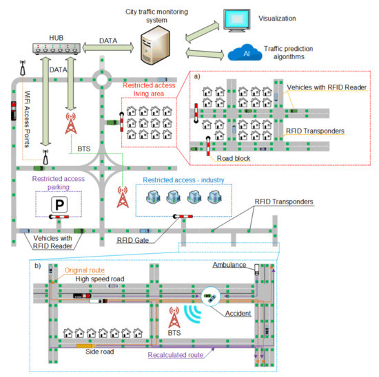 City traffic infrastructure with RFID transponders placed in the road surface: (a) RFID vehicle tracking, (b) the detection of an accident and route recalculation.