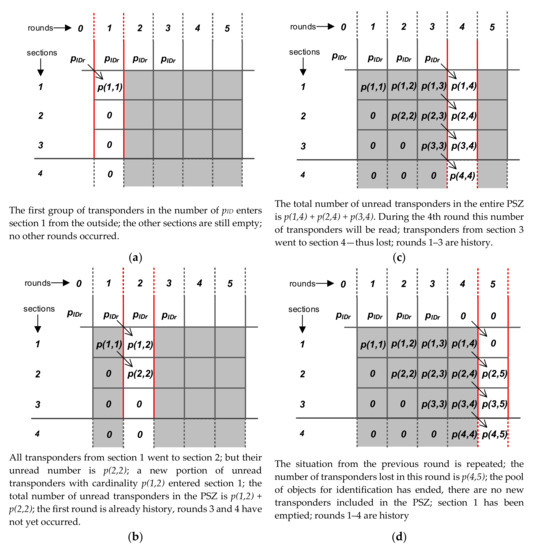 The task of the system is of course to read all transponders, which is why the number of lost transponders should be as low as possible. The essence of the system state representation is presented on the example of the matrix P in Figure 8 for the case when the PSZ contains 3 full sections, while Section 4, introduced here formally, is already outside the PSZ. The last element in the table presents the possibility of including a finite group of objects for identification. In this approach, it is relatively simple, while typical previous research assumed only infinitely long “streams” of objects for identification.