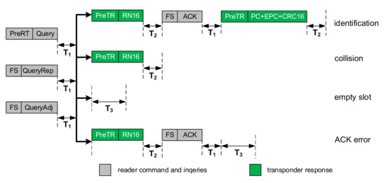 - The limited time of the inventory round. The round consists three types of slots: identification, empty and collision. Every type of slot has different duration (Figure 10). The number of all slots is limited according to Q algorithm. The parameter Q can be changed during the inventory round. In addition, the duration of each round is determined by the RWD and if the maximum round time is reached, the RWD interrupts the current round despite the actual number of slots. Otherwise, when the assumed number of slots is reached before the end of the round, the RWD waits idly until the round time elapses.