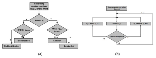where pi, pe and pc are the probabilities of correct identification, empty, and collision slot, respectively. The formulas can be derived both from the basic dependencies of the probability theory and from Bernoulli’s scheme [64]. These probabilities should be understood as the probabilities of the correct reading of one transponder, the occurrence of an empty slot, or a collision in one slot of a round. The round contains L slots, so the expected numbers of identifications, empty slots and collisions in a round are:
