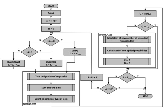 To be able to read multiple transponders, the RFID system must use some kind of multi-access technique. Most modern RFID systems use techniques based on TDMA (Time Division Multiple Access) methods [64,65]. The most popular method is FSA (Frame Slotted Aloha) [64,65] and its variants. This protocol extracts frames and time slots, which partly avoids data collisions and identifies three basic events that may occur during data transmission. They include correct data transmission, collisions, and empty gaps. Data exchange between the RWD and a single transponder takes place in a single time slot. Depending on the phenomena occurring during it, several types of these gaps are distinguished. The most desirable type is the slot in which the correct data exchange session between the RWD and the transponder takes place. The multi-access method used in this paper differs from FSA in that it allows dynamic adjustment of the number of slots in the data frame. The analysis of the ALOHA system operation [66] indicates that, in the best case, the probability of identification is 38%, while the probability of an empty gap and collision is 37% and 25%, respectively. In the model of the mobile object identification system it is therefore necessary to take into account all types of gaps, because the frequency of their occurrence undoubtedly affects the time of identification of a group of objects. Depending on the number of consecutive collisions or empty gaps, the round may be shortened or lengthened to ensure the adequate number of time gaps, to avoid collision, to reduce the number of empty gaps and to increase the identification efficiency. For the algorithm demonstration, the ISO 18000-63 protocol was chosen, which is dedicated for dynamic identification.