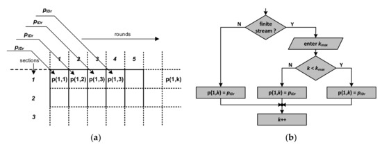 We will use matrix notation to represent the system state in sections and rounds, which is very convenient and creates new possibilities for analysis. It is generally assumed that the columns of the matrix will correspond to the next rounds of identification, while the rows will correspond to the next sections (Figure 7b). The dimensions of the PSZ are finite, therefore the number of matrix rows will be finite, whereas the number of rounds can be very large. This means that the horizontal matrix size can also be very large and increases with the duration of the identification process. However, thanks to this notation it is possible to record the status of all sections in a given round, to include the status of one section during individual rounds and to include changes in the number of transponders during their transition between successive sections in subsequent rounds.