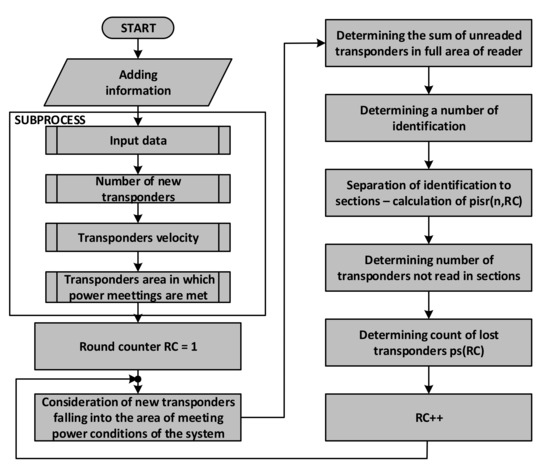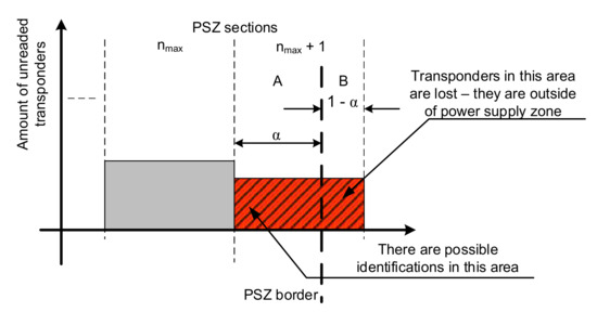 where the symbol E(·) means the integer part and dPSZ is the size of the power supply zone. Due to the cyclical operation of the system and the necessary simplifications conditioning the development of an effective model, it has been assumed that the transponder movement in the power supply zone is abrupt—the transponders enter subsequent sections, stop (and then the identification process is in progress), and after a certain duration of the round, they are transferred to the next sections, after which the whole process is repeated.