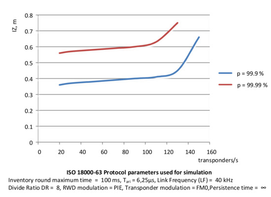 A similar situation occurs when the probability of identification is 99.99%. In this case, the size of PSZ must be correspondingly larger. Up to 150 transponders per second falling into the PSZ can be identified with the assumed protocol parameters, or even more in the future.