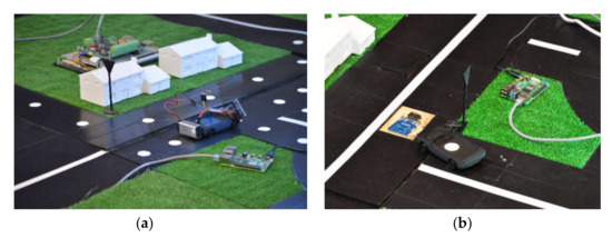 Other laboratory elements allow for the testing of selected RFID application scenarios in urban traffic. Some of them are shown in Figure 20. The laboratory model of a road infrastructure measuring 3 × 3 m has two sections. In the first one, RFID transponders are placed on the road infrastructure, and the RWD devices are mounted in vehicles (Figure 20a). The second section has RWD devices installed as part of the road infrastructure, while the vehicles are equipped with transponders (Figure 20b). The experiments were performed using the Arduino Nano modules as the vehicle’s on-board computer and the Raspberry PI 4 as a hub transmitting data to the city traffic control center. Communication between RPI 4 and Arduino Nano is done via WiFi using the ESP8266 module. Data from the vehicles and RFID devices installed in the road infrastructure is sent to the cloud based Azure IoT Hub for storing and further processing.