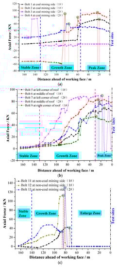 After the installation of each roadway measuring point, the monitoring system began to collect data. The monitoring began on 15 January 2017. As of 10 March 2018, the monitoring had lasted for 55 days. The working face was pushed by 180 m in total, and the real-time monitoring data of the bolt axial force of two measuring stations and three parts (coal side, roof, and non-coal side) were obtained. By sorting and analyzing the collected data, the bolt axis was obtained. The force distribution curve can be divided into two categories: horizontal and vertical. The stress condition of each bolt is compared in the horizontal direction. The stress condition of each bolt at the same position (1100 mm from the end of the bolt and 7th channel) in the entire mining process of the working face was selected for analysis. The results are presented in Figure 10a–c.