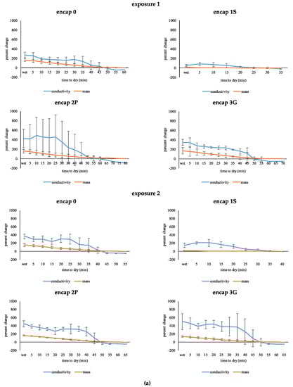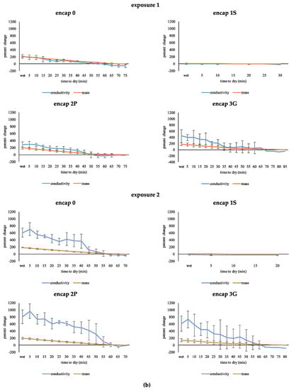 For both fabrics, drying time of each exposure and each functionalization were not significantly different. After approximately 60 (wool) and 70 min (cotton), fabrics were dry. Mass and electrical conductivity differed with exposure for wool (F1.15,9.21 = 352.43, p ≤ 0.01; F2.57,20.53 = 66.50, p ≤ 0.01, respectively) and cotton (F1.09,8.68 = 170.18, p ≤ 0.01; F2.20,17.56 = 80.68, p ≤ 0.01, respectively). Functionalization altered each response for wool (F3.46,9.21 = 25.01, p ≤ 0.01; F7.70,20.53 = 5.76, p ≤ 0.01, respectively) and cotton (F3.26,8.68 = 16.39, p ≤ 0.01; F6.59,17.56 = 13.19, p ≤ 0.01, respectively). Encap 1S specimens showed minimal changes; the presence of some surface water could account for the increase.