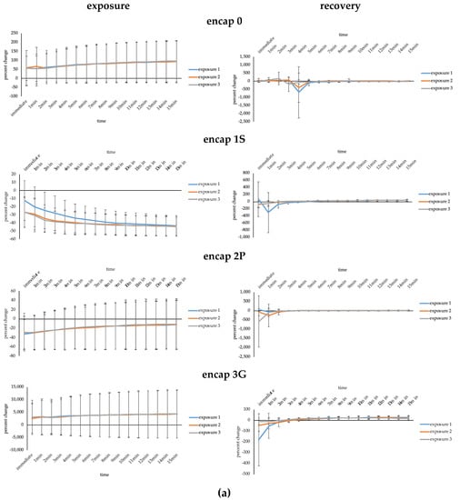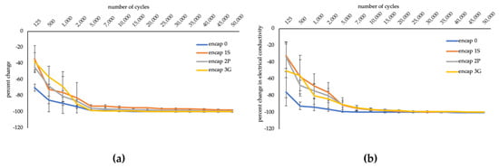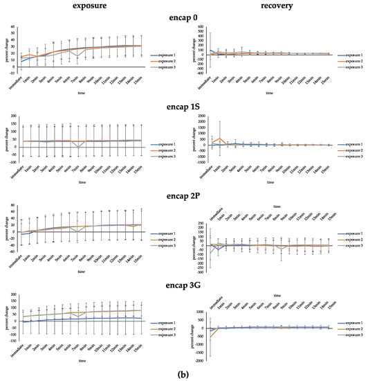 Performance with exposure and recovery to different ambient temperatures and relative humidity is given in Figure 2a,b. The pattern of change was similar for each of the three sequential exposures and functionalization had no significant effect on this response for wool or cotton. The response in electrical conductivity differed over 15 min of exposure for wool and cotton (F1.04,8.28 = 7.79, p ≤ 0.05; F1.90,15.23 = 61.06, p ≤ 0.01, respectively) and functionalization had an effect on the pattern of response (F3.10,8.28 = 6.23, p ≤ 0.05; F5.71,15.23 = 7.47, p ≤ 0.01, respectively). Encap 1S was most different, especially compared to encap 0 and encap 3G when comparing functionalization treatments for wool and cotton specimens. For wool, change was increasingly negative for encap 1S, showing opposite effects to remaining functionalized specimens (encap 2P also had a negative change but showed low change with increasing time). Whereas encap 1S use for cotton resulted in minimal responses to temperature and humidity fluctuations.