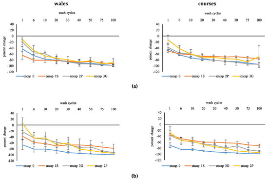Functionalization had an effect on mass and thickness of the wool (F5,24 = 566.07, p ≤ 0.01; F5,24 = 29.60, p ≤ 0.01, respectively) and cotton (F5,24 = 490.72, p ≤ 0.01; F5,24 = 21.74, p ≤ 0.01, respectively). A small increase in mass and thickness was evident with encap 0 (20 and −1% for wool, 26 and −7% for cotton, respectively) and when measured sequentially (wool: −0.3%; cotton: −0.7%). Mass and thickness increased with encap 1S (79 and 17% for wool; 48 and 7% for cotton, respectively). Encap 3G and encap 2P caused a decrease or minimal change in mass (wool: −6, −8%; cotton: −9, −15%, respectively) and thickness (wool: −8, −5%; cotton: −0.2, 2%, respectively).