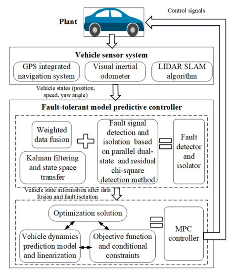 The flowchart of the fault-tolerant model predictive control algorithm designed in this paper is shown in Figure 1. Vehicle motion status information can usually be obtained by GPS combined navigation system, visual odometer, and LIDAR SLAM. These sensors and algorithms together form an on-board perception system.