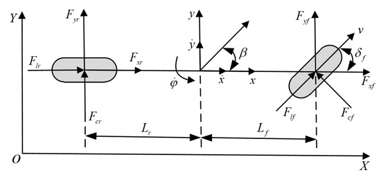 where m is the vehicle mass; is the yaw angle; x and y are the longitudinal and lateral position, respectively; is the front wheel rotation angle; is the z-axis moment of inertia; is the total longitudinal force on the vehicle; is total lateral force on the vehicle; is the total yaw moment on the vehicle; , are the lateral forces on the front and rear tires of the vehicle, and are related to the corner stiffness and corner angle of vehicle tires; , are longitudinal forces on the front and rear tires of the vehicle, which are related to the longitudinal stiffness and slip rate of the tire; , are the forces on the front and rear tires in the x direction; , are the forces on the front and rear tires in the y direction; and are the distances from the front and rear axis to the center of mass.