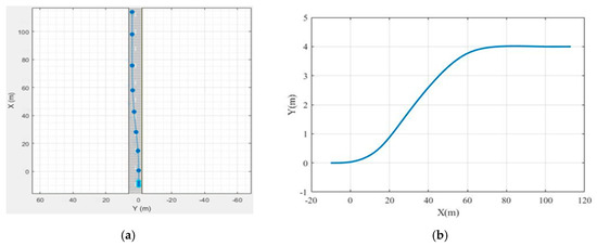 In Figure 5a, the simulation vehicle starts from the right lane and then changes lanes to the left. From Figure 5b, we can observe that the simulation vehicle is initially located at x = −10, y = 0, and then changes lanes at x = 0, y = 0. The lane changing process is completed at x = 80 m, and the position of the center of mass on the Y-axis reaches y = 4 m.