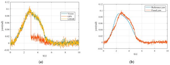 The yaw angle: (a) yaw angle detected using different sensors; (b) the reference and fused yaw angle.