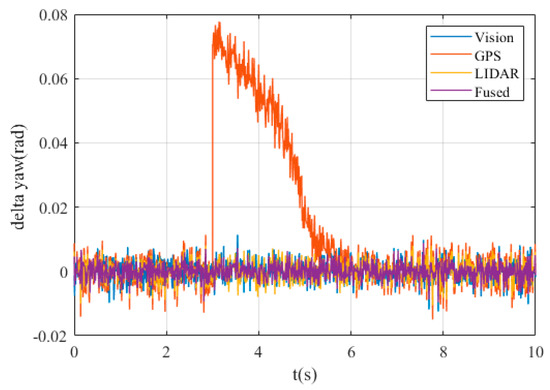 The horizontal axis represents time, and the vertical axis represents the values of yaw angle. It can be seen that from moment 0s to 3s, the measured values of Vision, GPS, and LIDAR systems are similar. In the simulation process, we assume that the GPS signal has interfered from 3 to 6 s, and the obtained yaw angle value has a large deviation. After 6s, the GPS signal returns to normal.