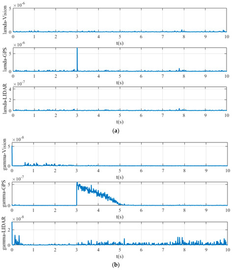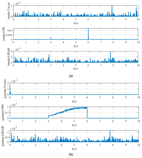 In Figure 11a, it can be seen that the calculated values of state chi-square test of vision and LIDAR channels are very small, basically below 2 × occasionally exceeding the order of magnitude , but they are still extremely small. Comparatively, the data of GPS channel reaches the order magnitude of at 3 s, or even more than at 6 s, which is much larger than that of vision and LIDAR channels. In Figure 11b, the calculated value of vision channel reaches about 1 × at the initial stage but always below the order magnitude of in the following time. The calculated value of GPS data is extremely large from 3 s to 6 s, reaching the order magnitude of due to the GPS sensor failure. The calculated values of LIDAR data fluctuate greatly, but they are all below 1 × , which is also a reasonable interference situation.