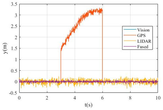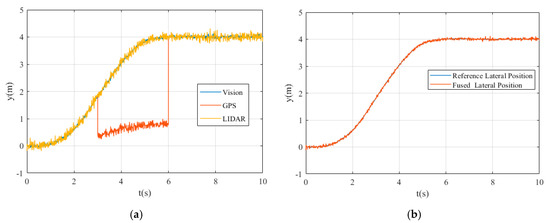 Figure 9a shows the lateral position changes of the vehicle obtained by Vision, GPS, and LIDAR sensor systems. Figure 9b shows the reference lateral position of the vehicle and the lateral position after data fusion.