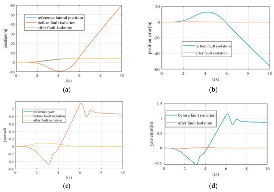 The path tracking control simulation results: (a) the lateral position changes; (b) the lateral position error before and after fault isolation; (c) the yaw angle changes; (d) the yaw angle error before and after fault isolation.