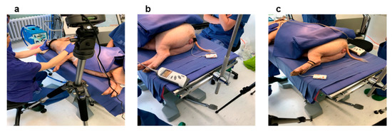 Over the course of this study, all measurements were conducted on a female Göttinger Minipig (test pig) under both anaesthetised and non-anaesthetised conditions. The test pig was born on 28.04.2017, with a 0.99 m back length (nose to tail) and weighing 30.2 kg on the day of experiments. The experiments were conducted in the Institute for Laboratory Animal Science, Hannover Medical School, Hannover, Germany. The measurements were obtained as part of a medical experiment to investigate and optimise liver cell transplantation. The original study and all measurements were ethically approved by “Niedersächsisches Landesamt für Verbraucherschutz und Lebensmittelsicherheit” (LAVES) (Germany; 33.12-42502-04-16/2374). Due to predefined planning in the ethical committee document, only one test pig was assigned for this study, which is considered enough for a proof-of-concept and pilot study.