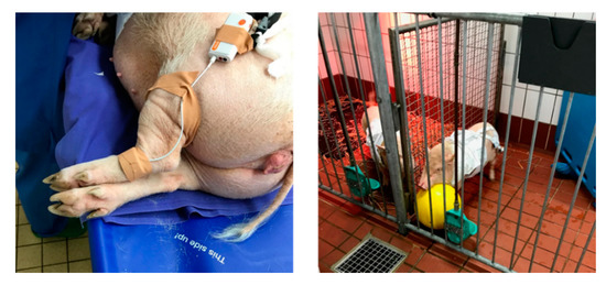 The PPG sensor is placed on the left back leg (below the knee) of the non-anaesthetised pig (left photo) and then the animal is allowed to move freely in a pen (right photo).