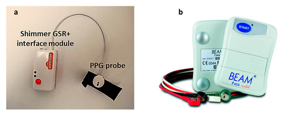 As a gold standard for heart rate measurements, continuous ECG measurements were performed. The ECG measurements were performed using a portable ECG recorder: BEAM® ECG 3-channels (Figure 3b) Loop/Event recorder (IEM GmbH; Stolberg, Germany). It is an on-body portable ECG recorder, with three electrodes to stick on to the skin. The recorded ECG signal is automatically transferred from the BEAM® via Bluetooth to a smartphone, and is forwarded from there to a secure database. The BEAM® recorded the ECG data every 0.6 s.