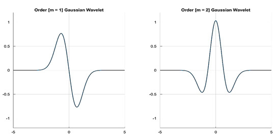 As explained earlier, even order (with order ) derivative Gaussian (DOG) wavelets are chosen to calculate the CWT of the PPG signals. In particular, three orders of the DOG wavelet, namely, = 2, 4 and 6, are tested. In the Fourier domain, the m-th order derivatives of Gaussian wavelets, DOG, are defined by: