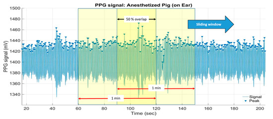 The heart rate in bpm is calculated based on the number of detected peaks within a sliding time window or an epoch of one minute, with 30 s (50%) overlap (Figure 6).