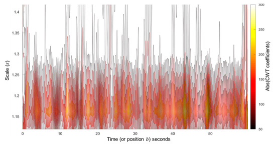 The scalogram of the chosen set of scales () shows the scales dominated by the energy (high absolute CWT coefficients) from the cardiogenic pulse signal, calculated using the fourth order DOG wavelet.